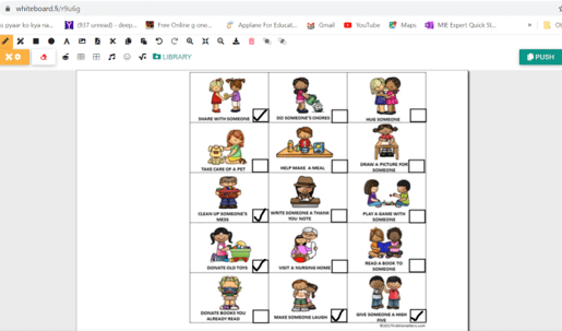 Whiteboard.fi is an online collaboration tool which allows to share ideas with others. Students learned to match pictures with their shadow thereby helping them to enhance their thinking skills using the elements of whiteboard. They also played a kindness bingo game using Whiteboard ,where the grids/boxes were filled with images of different acts of kindness. Students marked every random act of kindness they had performed.