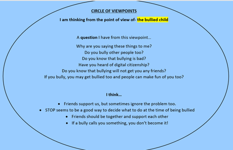 Students then used the ‘Circle of viewpoints’ VTR to analyze cyber-bullying from the perspective of a child who had been bullied or was a bully. They came up with insightful thoughts from both perspectives and tried to understand the emotions of both the bully and the bullied.