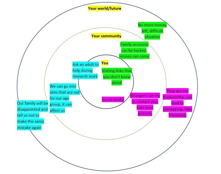 Students learned the importance of security and privacy to surf the internet and what it means to be safe. They reflected upon how to behave in different scenarios.
