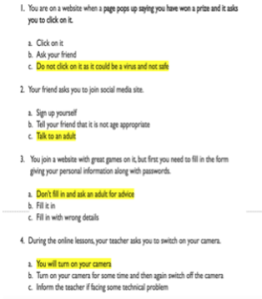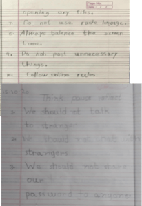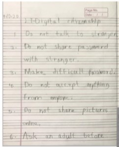 Students were apprised about personal and private information; what information is safe and secure to share online. They were made aware about the importance of password and password management. They learned how to be safe, responsible and respectful online.