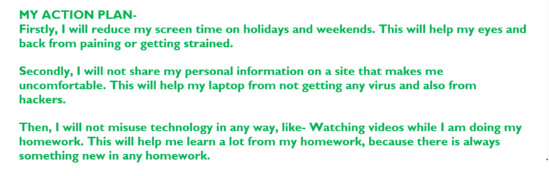 Students created an action plan to express how they would become responsible digital citizens and generate awareness about the same.