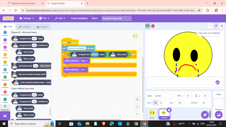 Using Scratch along with Teachable Machine, students of Grade 4 integrated machine learning into their projects by training models to recognize inputs such as text, images, or sounds. They explored the working of machine learning by teaching the computer to respond differently based on the input it received thereby making their projects interactive and intelligent.