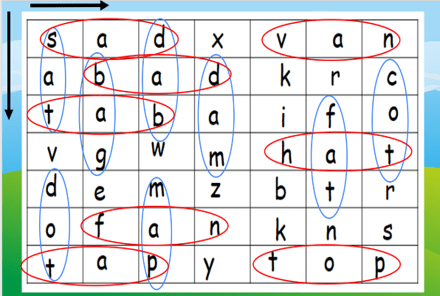 CVC word families have been introduced in class using Google Slides. A formative assessment was conducted on short vowel ‘a’, ‘op’ and ‘ot’ families with a word-search activity using the google slides. Students identified CVC words and circled them horizontally or vertically from a mixed pool of letters.