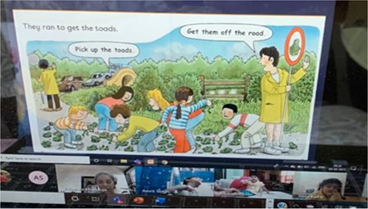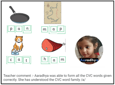 To strengthen the concept of CVC/a/family words Google Jamboard was used wherein students identified pictures and then spelt them.