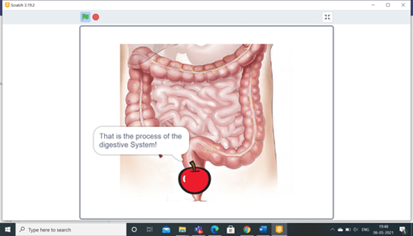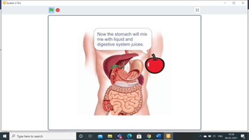 Fourth graders were introduced to an upgraded level of the visual programming language Scratch. Students were able to develop their capacity to be more structured and organized in the management of resources and the use of tools that led them to create a scratch project that demonstrated the working of the digestive system.