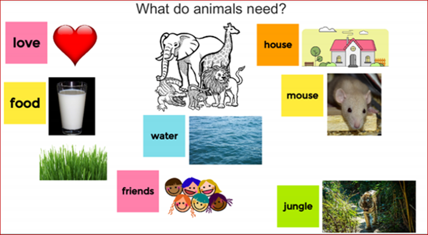Jamboard and a VTR ‘Think-Pair-Share’ were used for an activity where students individually pondered and then discussed what animals need, with their partners. This routine encouraged students to think about the topic and then articulate their thoughts.